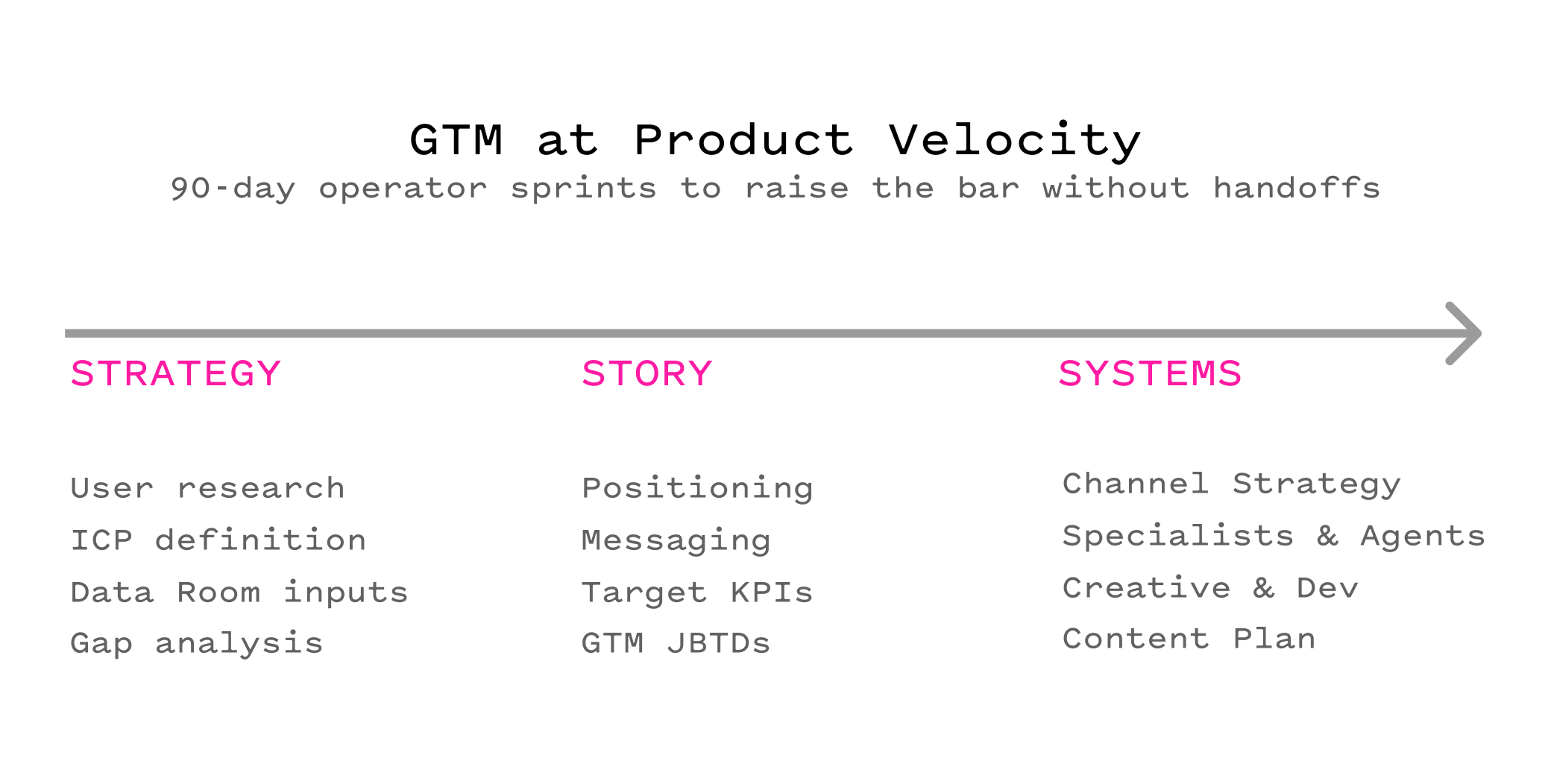 That’s why our work begins upstream. We co-build a data-driven GTM strategy and execution models alongside founders, pulling from operator experience. Only after there is strong alignment do we start to begin developing deliverables or shipping assets. Product, marketing, sales, and brand move together or they don’t move at all.