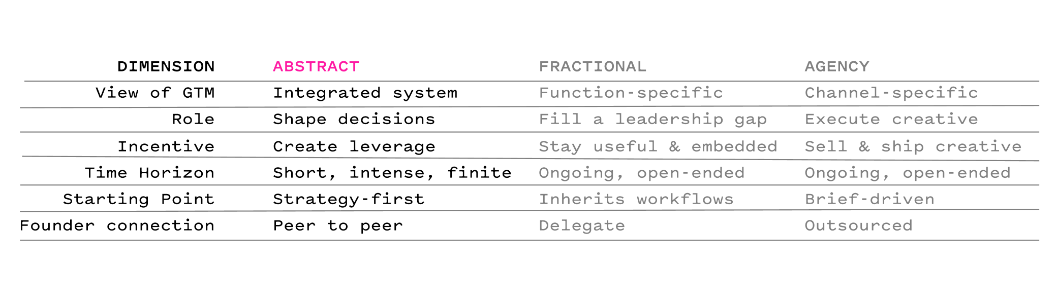 Abstract’s model exists to close that loop. We take a generalist view, connect the strategic dots, and help founders make calls that hold up six and twelve months later.